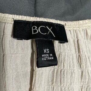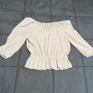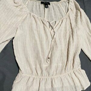 Purchased new and never worn, sheer beige off shoulder blouse by BCX. Size is XS and it’s cinched at the waist. Very lightweight material!