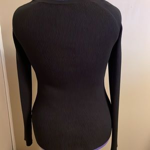 Black Ribbed, long sleeve, with detail at Shoulders. 80% Rayon/ 20% Polyester. Good Condition