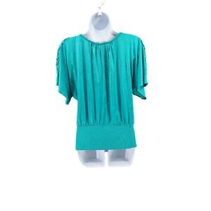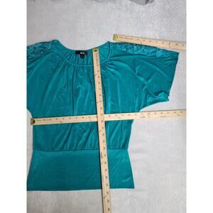 BCX VTG Y2K Women Blouse Satiny Teal Size small Cinched waist lace sleeve fairy