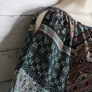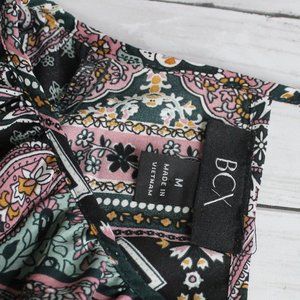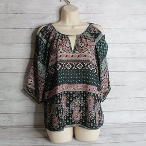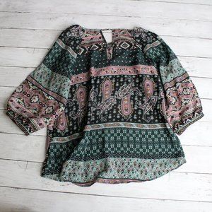 BCX Women's Boho Top Size M Green Pink Floral 3/4 Sleeves