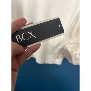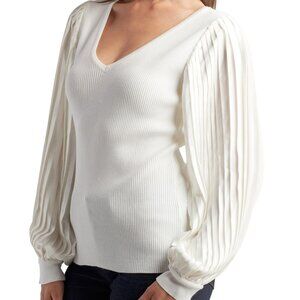 Elevate your wardrobe with this BCX women's sweater featuring a ribbed knit body and contrast pleated balloon sleeves. Ideal for both professional and casual settings, this versatile piece offers a sophisticated look with its elegant V-neck and contemporary design. Pair it with jeans or skirts for a polished ensemble. Juniors large=Womens Medium