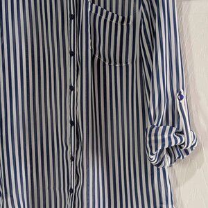 BCX women's sheer collared blouse in blue and white stripes, size medium, featuring long sleeves with buttoned cuffs, button-down front, single chest pocket, shoulder epaulets, and roll-tab sleeves with button straps for adjustable styling (shown in photo with one sleeve rolled). Pre-owned. One cuff button is missing but includes an extra button inside, and a snag on the bottom front right, both visible in photos. Made of 100% polyester, machine washable. Measures approximately 18.5" armpit to armpit, 25" from center back of neck to hem, and 24" sleeve from shoulder seam to cuff.