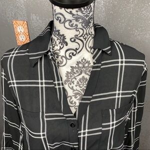 BCX. Black and white plaid button up collared shirt. 3/4 sleeve with roll tab sleeves. 100% polyester. Size XL.
