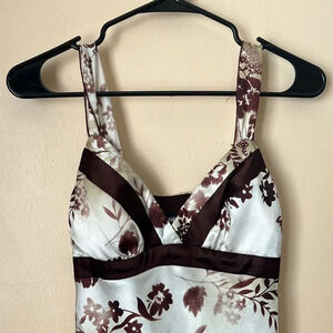 Cream and brown floral design. A little padding in the bust. Very cute and classy juniors dress!