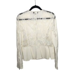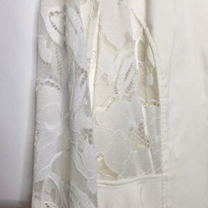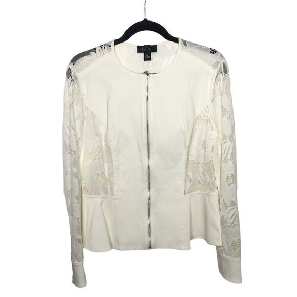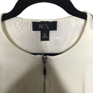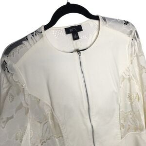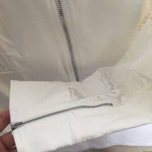 BCX Women's jacket in off white with zipper front. Lace sleeves with zipper at sleeve. Lace back to waist line. Fuller cut around waist line with stretchy polyester material.
