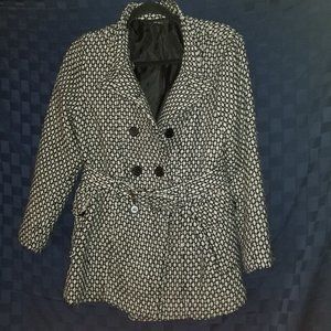This is an adorable black and white wool coat by BCXgirl in size XL. It would definitely fit a woman size medium and has some weight to it. It has black lining on the inside, pockets on both sides, a buckle belt around the waste, large black buttons up the front. It is gently used with LOTS of life left, I'm sad my daughter out grew it.