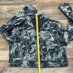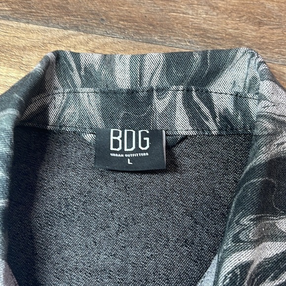 This BDG bomber jacket features a striking black and gray swirl pattern, offering a contemporary and dynamic look. The cropped length and lightweight material make it perfect for layering, while the high collar adds a touch of sophistication. Ideal for those seeking a bold and modern addition to their outerwear collection.