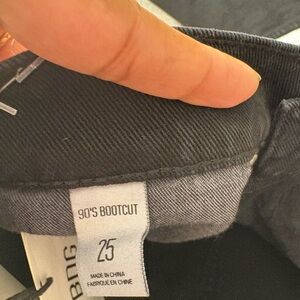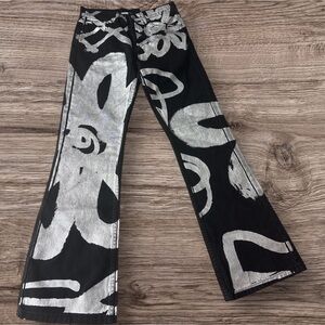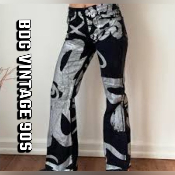 These BDG jeans feature a striking black and silver color palette with a bold, artistic design that flows across the wide leg silhouette. The flare style adds a touch of retro flair, making them a standout piece for any wardrobe. Perfect for those who love to make a statement with their fashion choices.