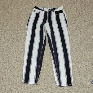 BDG jeans feature a striking black and white vertical stripe pattern. Women's sz 27 " mom jeans". 100% cotton, 11" rise, 29" inseam (WP1-029)