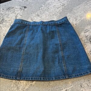 Chic A-line denim skirt with button-front. Features dual front pockets. Ideal for everyday wear. Waist 14”. Length 16”.