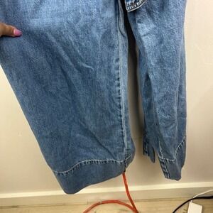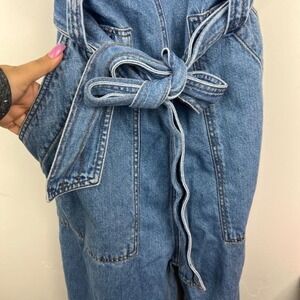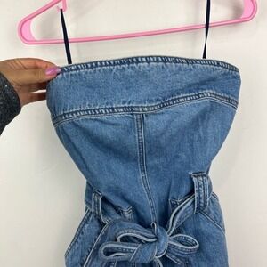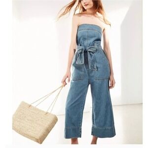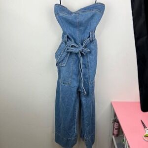 Stylish strapless denim jumpsuit. Features a tie waist and wide legs. Perfect for casual outings.