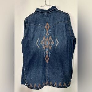 BDG Blue Distressed Denim Button Down Shirt W/ Design Size Large Coastal Cowgirl