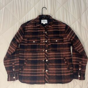 BDG jacket with a quilted interior. Features a brown and black plaid pattern. Ideal for layering.