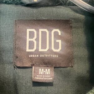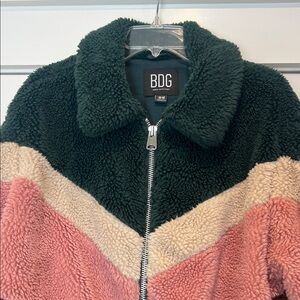 Stylish BDG sherpa jacket with chevron design. Features rich green, soft cream, warm pink, and deep brown hues. Ideal for cozy, fashionable wear. Size medium. There is a small tear in one of the pockets, but it’s nothing major. Measurements lying flat: Pit to pit: 23 inches Pit to bottom hem: 12 inches Sleeves: 23 inches