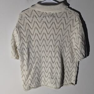 Cream knit button-up cardigan with a zigzag pattern. Short sleeves and a classic collar.