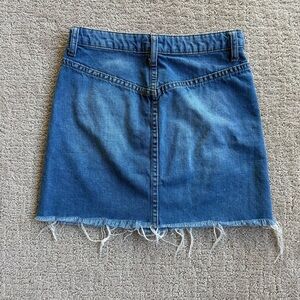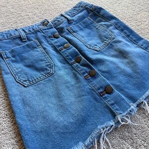 Elevate your style with this chic denim button-front skirt. Perfect for casual outings, this blue skirt offers a trendy look with its frayed hem and front pockets. A must-have for any wardrobe.