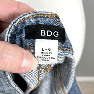 BDG Denim doodle graffiti print distressed raw hem mini skirt, size large. Great condition, minor discoloration which may be part of the manufactured distressing. Approximate measurements 17” across waist laying flat, 15” length.