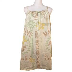The dress features a fun, vintage-style graphic print with keywords like "Surf," "Waves," and "Island," giving it a cool, Hawaiian-inspired or coastal vibe.