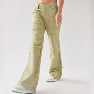 green cargo, low rise, workwear style, utility pants, zipper details, pocket accents, streetwear, relaxed fit, outdoor aesthetic, functional fashion