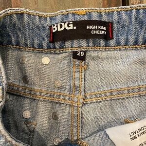 BDG High Rise Cheeky Cutoffs Denim Shorts, Distressed With Silver Studs, Size 8 (29). Preowned. Nice condition. Waist measures approx 28”. Inseam measures approx 1.5”. Rise measures approx 12.25”. 100% cotton, non-stretch denim. Adorable shorts with stud detailing and a flattering high rise.
