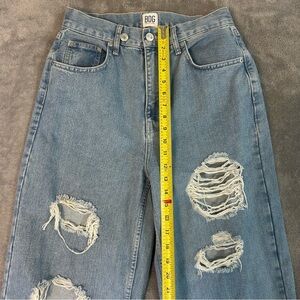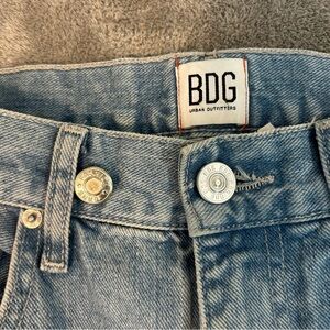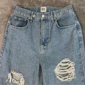 These BDG boyfriend jeans feature a light blue wash with a high-waisted fit and a relaxed, casual vibe. The jeans are characterized by their significant distressing, with large rips and frayed edges on the front, offering a trendy, worn-in look. Perfect for a laid-back day out, these jeans combine comfort with contemporary style.