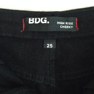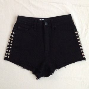 High-Rise denim cutoff short topped with metal come studs along sides. Cut super short and angled. Touch of spandex for stretch. 5 pocket styling. Frayed hem and high rise zip fly. Purchased at Urban Outfitters. Only worn once. In perfect condition. Original Price $69 Asking Price $30