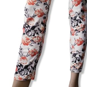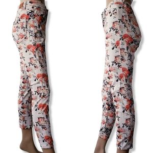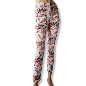 White, Ivory, Orange, & Black floral print skinny jeans. High rise waist , twig, ankle length with front and back pockets, fly zipper closure, and belt loops. Fitted with stretch.