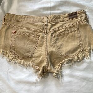 These BDG jean shorts feature a stylish distressed design with frayed edges, offering a casual and worn-in look. Crafted in a versatile tan color, they are perfect for laid-back summer days.