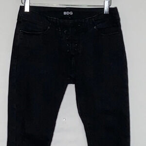 BDG Low Rise Twig Lace Up Crop Jeans in Black in a tagged waist size 25, length 27. Great pre-owned condition. Low rise, factory distressed, ankle grazers, lace up closure with inner button, skinny fit. Approximate measurements: 14 1/2" waist, 8" rise, 26" inseam. Sold at Urban Outfitters.