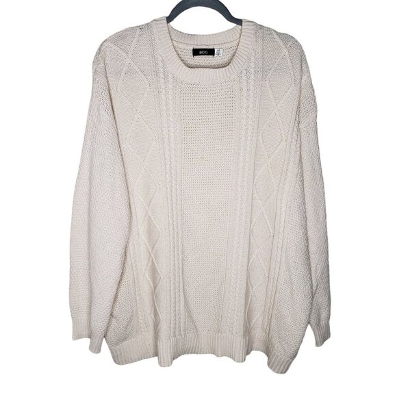 BDG Men's Size L Cotton Blend Fisherman Knit Sweater Elbow Patches LightWeight Ivory