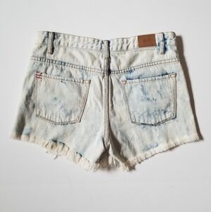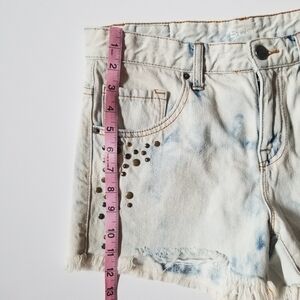 BDG Mid Rise Freja Vintage Fit Shorts, acid washed denim, rivet studded detail, distressed, frayed hem, functional pockets front and back, zipper and button closure to front, see photos for measurements, great pre worn condition, size 27 w