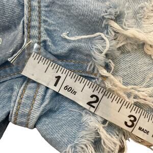 Medium wash with light whiskers on the front. Distressed hem and bottom. Zip and button closure. Five pocket style. Beach, vacay, summer, travel