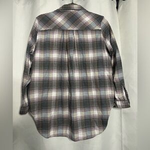 BDG Obie Flannel Button-Down Shirt. Essential soft cotton flannel shirt from UO's original staple label, BDG, cut in a long, drapey silhouette. Trimmed with a button-down front, slit pockets at the chest and a rounded shirttail hem. Colors are grey, white, light blue, and lavender. Cotton. Size XS (oversized, relaxed fit).