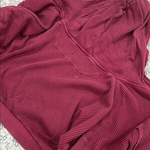 Stylish raspberry jacket with hood. Features textured fabric and front pockets. Perfect for layering. Worn only once. Slight discoloration on the back as notes in second photo.