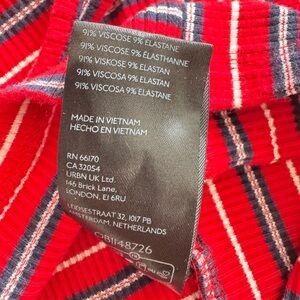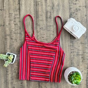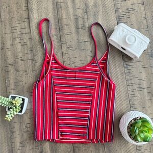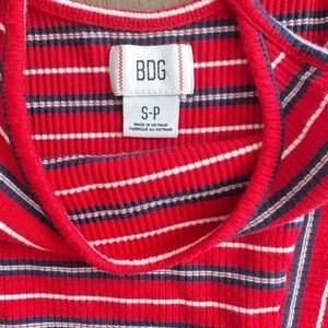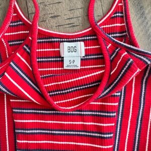 This sleeveless camisole from BDG features a striking red and black striped pattern, offering a bold and stylish look. The fitted design and crop length make it a perfect choice for a trendy, casual outfit. With its classic scoop neckline and thin spaghetti straps, this top combines comfort with a modern edge.