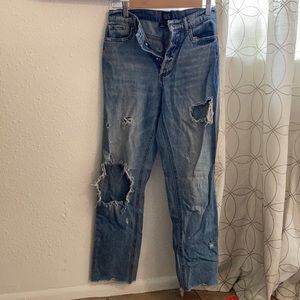 One of my favorite pairs of jeans, just too small for me now. Has one styled big open whole rip in the knee with other smaller styles rips. Slightly high waisted with three buttons.