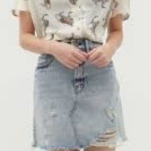 Quintessential cool-girl mini skirt from BDG. Built from a distressed denim with a raw hem for a laid-back look. Sits high on the waist with a button closure and pocket detailing.