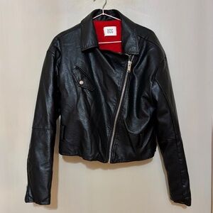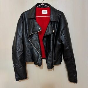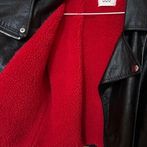 Urban Outfitters BDG Sherpa Lined Collared Crop Faux Leather Jacket in Black with Red Sherpa Lining and Womens Size Medium. Gently used and in excellent condition.