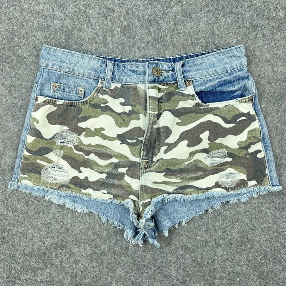 BDG Shorts Womens 28 Blue Camo High Rise Dree Cheeky Frayed Cutoff Denim Jeans