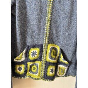 This is a women's blue wool blend zip front hooded cardigan sweater with granny square crochet pockets from BDG, size Large. This is in very good condition.