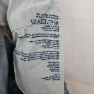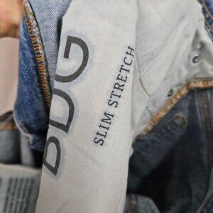 These BDG Slim Stretch jeans are crafted with a blend of cotton and elastane, offering both comfort and flexibility. The light wash denim adds a casual, stylish vibe to any outfit. Designed for men, these jeans are sized 32x30, ensuring a snug yet comfortable fit. Note the minor distress near the back pocket, which adds character to the garment.