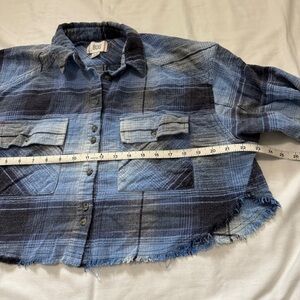 BDG Small Oversized Joey Shirt Jacket ~ Blue Plaid Button Down Cropped Raw Hem