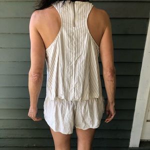 Linen pin striped set from Urban Outfitters. Size medium top, size large bottoms. Can be both dressed up and dressed down, and is the most comfortable.