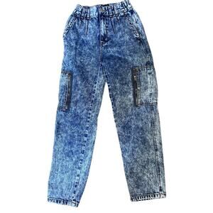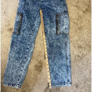 Acid wash jeans, high waisted, cargo style, straight leg, zippered side pockets, vintage denim, retro 90s fashion, relaxed fit jeans, casual streetwear, blue wash, utility pants, women’s denim trousers, full length jeans, trendy throwback style.