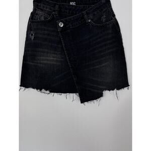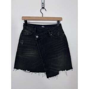 BDG Urban Outfitters black denim mini skirt featuring an edgy asymmetrical wrap-style front, frayed hem, and distressed details.