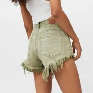 BDG Urban Outfitters moss green high-rise cheeky shorts, women's size 28. Distressed and frayed design that hugs the body with fringed cut-off hems. Features five pockets and a zip fly for functionality. Trendy and comfortable, perfect for warm-weather outfits.