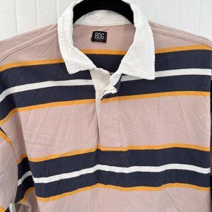 BDG Urban Outfitters long sleeve 3/4 button up striped cropped collared top. White, peach, yellow, and navy stripes with a white collar.