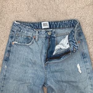 BDG - Urban Outfitters - MOM - Light wash, high rise, distressed denim jeans with raw hem. Traditional 5-pocket style with belt loops. Lighter circle on rear left, see photo. Size womens 26