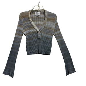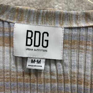 This super cute BDG by Urban Outfitters ribbed long-sleeve henley is perfect for layering and everyday wear. Soft, stretchy, and lightweight with a flattering fitted silhouette. Features a cropped cut, ribbed texture, and snap button neckline. Neutral blue/gray + tan stripe pattern makes it easy to style.