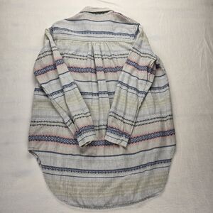 This Urban Outfitters shirt for women in size XS features a unique Aztec Southwest pattern on 100% cotton material. It has a collared neckline, long sleeves with cap sleeve detail, and a button closure. This lightweight and breathable button-up shirt is suitable for travel, casual wear, or work attire, making it versatile for different occasions. The multicolor design adds a colorful and classic touch to the wardrobe, perfect for all seasons including winter, summer, fall, and spring.